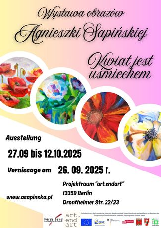 《Kwiat jest uśmiechem – The flower is a smile》是波兰艺术家Agnieszka Sapinska的个人展览,将在柏林的art.endart空间展出。Sapinska自幼患有脑瘫,自1995年起以口作画,擅长以油画技法描绘花卉与风景。她是世界口足画家协会(VDMFK)成员,作品曾在欧洲多地展出。Sapinska的画作以明快色彩和生命力著称,传递出对自然与生活的热爱。本次展览将带来她最新的花卉主题创作,展现艺术家以坚韧和乐观面对人生的态度。