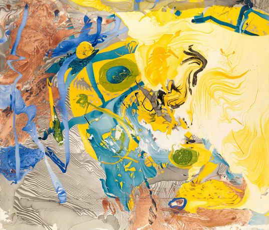 这件创作于1962-63年间的作品是“漆皮”技法的典型代表。艺术家将清漆滴在水面,通过引导和偶然的相互作用,在纸上形成了一幅165 x 193厘米的宏大画面。其纹理酷似狂野的风暴或奇幻的地貌,展现了材料本身不受控制的动态美感与艺术家精妙操控之间的张力。作品以单色(grisaille)呈现,强调了形态与肌理本身的表现力。