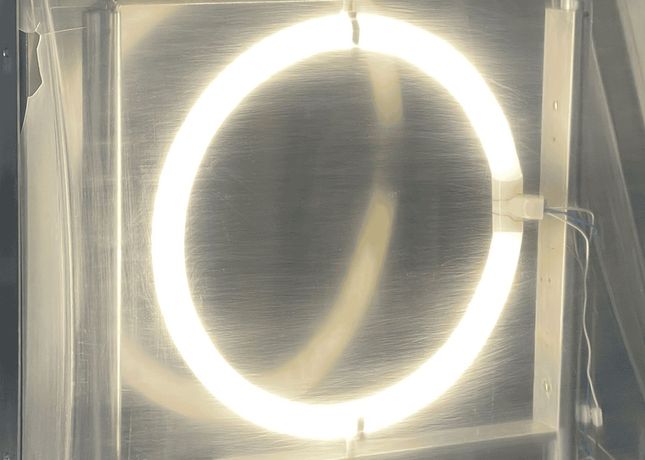 展厅入口处高悬着的灯光装置,原为发光标识,如今被剥离内容,仅剩透明面板、裸露铝材和电子元件。冷白色圆形光环持续发亮,象征现代性承诺的循环与自我指涉,既是秩序的象征,也是意义消解的隐喻。