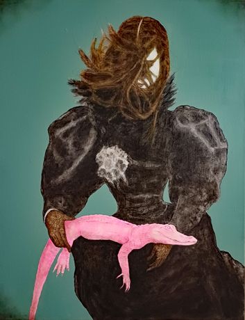 这幅作品以丙烯和金色颜料在画布上创作,展现了Johnston标志性的神秘氛围和强烈色彩。画面中的人物形象紧扣展览“可见与不可见”的主题,既有现实的凝视,也带有梦境般的朦胧感,体现了艺术家对人类孤独与内心世界的敏锐捕捉。