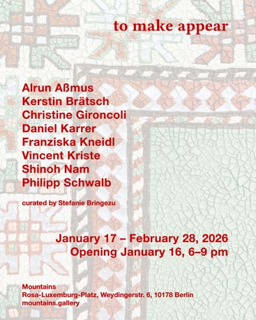 “to make appear”是一场聚焦于混合媒介与多学科创作的群展,将于柏林Mountains画廊举办。本次展览由策展人Stefanie Bringezu主导,旨在探索艺术家如何通过不同媒介与表现手法,使隐匿的主题与情感“显现”于观众面前。展览汇集了多位活跃于当代艺术领域的创作者,强调跨界合作与材料实验,呈现出丰富多元的视觉体验。Mountains画廊以其支持先锋艺术实践而闻名,此次展览也延续了其推动创新与对话的传统。