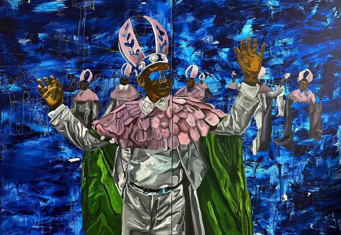 这幅双联画作采用油画、永久记号笔和丙烯颜料创作,每幅160x120厘米。作品以鲜明的色彩和动态线条描绘了桑巴文化的精神象征,展现了巴西黑人群体的自豪与活力。画面中融合了O Bastardo标志性的城市元素与非裔宗教符号,呼应展览对身份与文化根源的探讨。