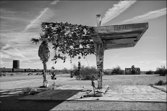 Dressel以北美莫哈维沙漠为背景,捕捉荒凉车站的孤寂与超现实氛围。画面中遗世独立的建筑,映射出人类在时间长河中的渺小与坚韧。