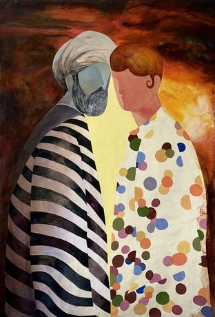 本作以波斯文化中表达喜悦的手势为灵感,同时隐含对丢勒《祈祷之手》的致敬。通过手势与色彩的结合,Alimirzaee巧妙地将个人与集体、传统与现代、宗教与世俗的多重意涵融入画面,展现身份与文化的复杂交织。