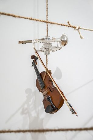 这件装置作品融合了多种滑轮、不同材质的绳索、西西里篮子(内含意大利语与英语文字)、小提琴及两件被切割并拼接的乐器(小号与长笛)。Santoro通过这些元素,探讨语言、动作与时间的交错,呼应展览对“昼夜周期”与感知流动的关注。观众可在作品的物理结构与文本碎片间,体验多重意义的生成。