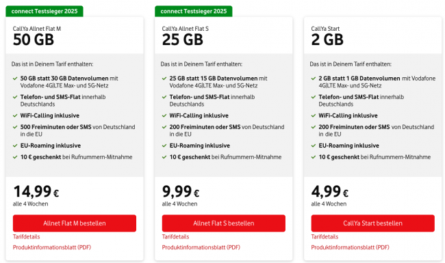 CallYa 预付费卡:无合约、无开通费、无月租,可灵活购买流量包,欧盟漫游包含在套餐内