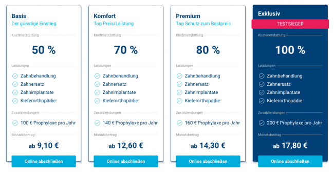 套餐主要分Basis,Comford,Premium,Exklusiv四种,随着保额的增加,相应的报销比例也会增加,报销比例依次为50%,70%,80%和100%!其中,Exkulusiv 套餐最高可享受100% 的报销费用哦。如果牙齿问题比较严重,每年需要定期做检查和修复的小伙伴可以考虑这个套餐。