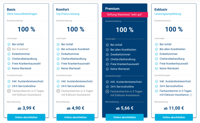 有 4 个套餐:Basis、Komfort、Premium、Exklusiv,其中 Komfort 套餐在保障范围和价格之间性价比很高。你可以根据自己的情况选择适合的套餐。注意:这份补充险的前提是必须已参加德国的法定健康保险。