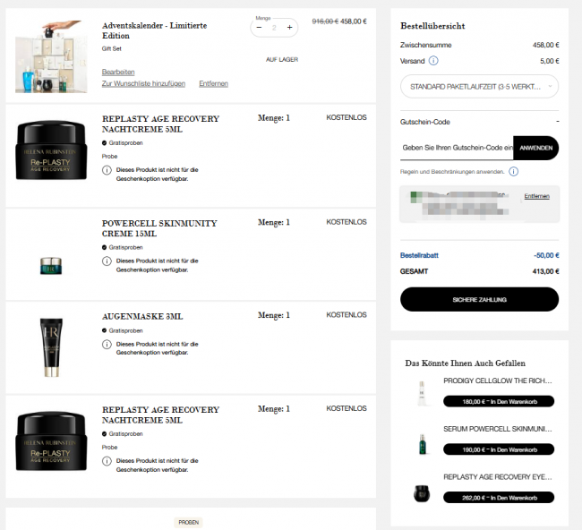 ⚠️ 一单购买多个该礼盒只会收到1个50€代金券码哦!并且每单只能用1个50€代金券码!代金券码有问题的话可以直接给客服发邮件!小编发邮件要码马上收到回复了!
