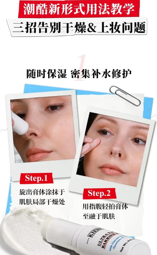 2️⃣ 妆后可用,不花妆、当你在带妆情况下感觉皮肤干燥、起皮时,可以直接用保湿棒在干燥区域(如鼻翼、脸颊、法令纹)轻轻涂抹
