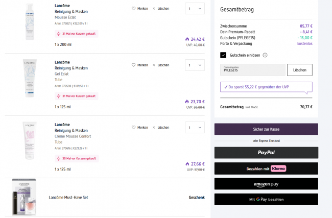 需叠加会员9折➕满49€立减15€码(变相69折):PFLEGE15