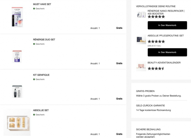 菁纯乳霜5ml(27€)+ 菁纯眼霜5ml(40€)+ 菁纯玫瑰精华水15ml(13€) + 菁纯精华5ml(52€)➕小黑瓶精华10ml+大眼精华5ml➕塑颜面霜15ml+塑颜眼霜5ml➕美丽人生Q香+三管精华3ml+迷你睫毛膏2ml!