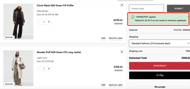 购物车限750€以内可使用折扣码,超额请分批下单!