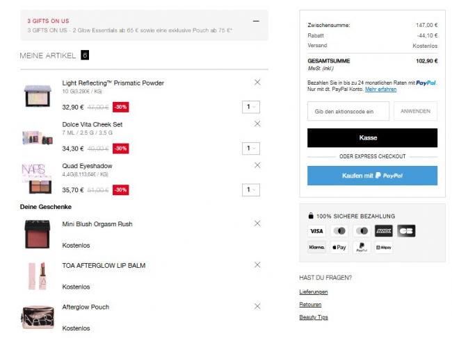 ❄️尖叫💢NARS官网全场7折⭕送3件好礼🎁限定月光大白饼仅32€💜蝴蝶效应4色眼影35€!