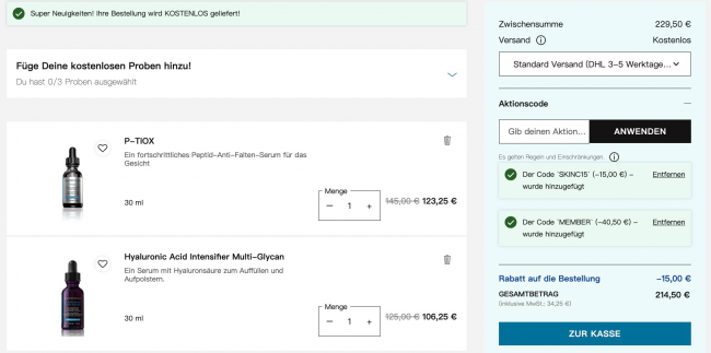 🎁 购物车还能再任选3个4ml精华试用装,共12ml,宝宝们选最贵的CF或CE精华最划算!4ml就价值24€啦!