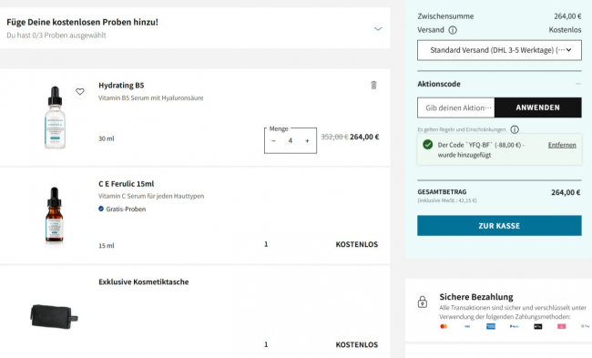 🎁 购物车还能再任选3个4ml精华试用装,共12ml,宝宝们选最贵的CF或CE精华最划算!4ml就价值24€啦!