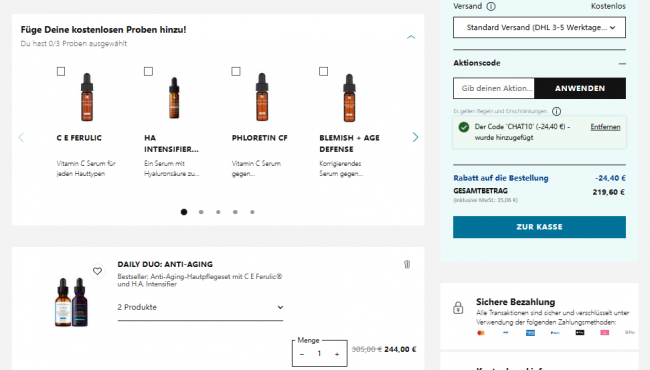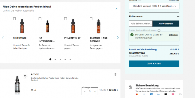 🎁 购物车还能再任选3个4ml精华试用装,共12ml,宝宝们选最贵的CF或CE精华最划算!4ml就价值24€啦!