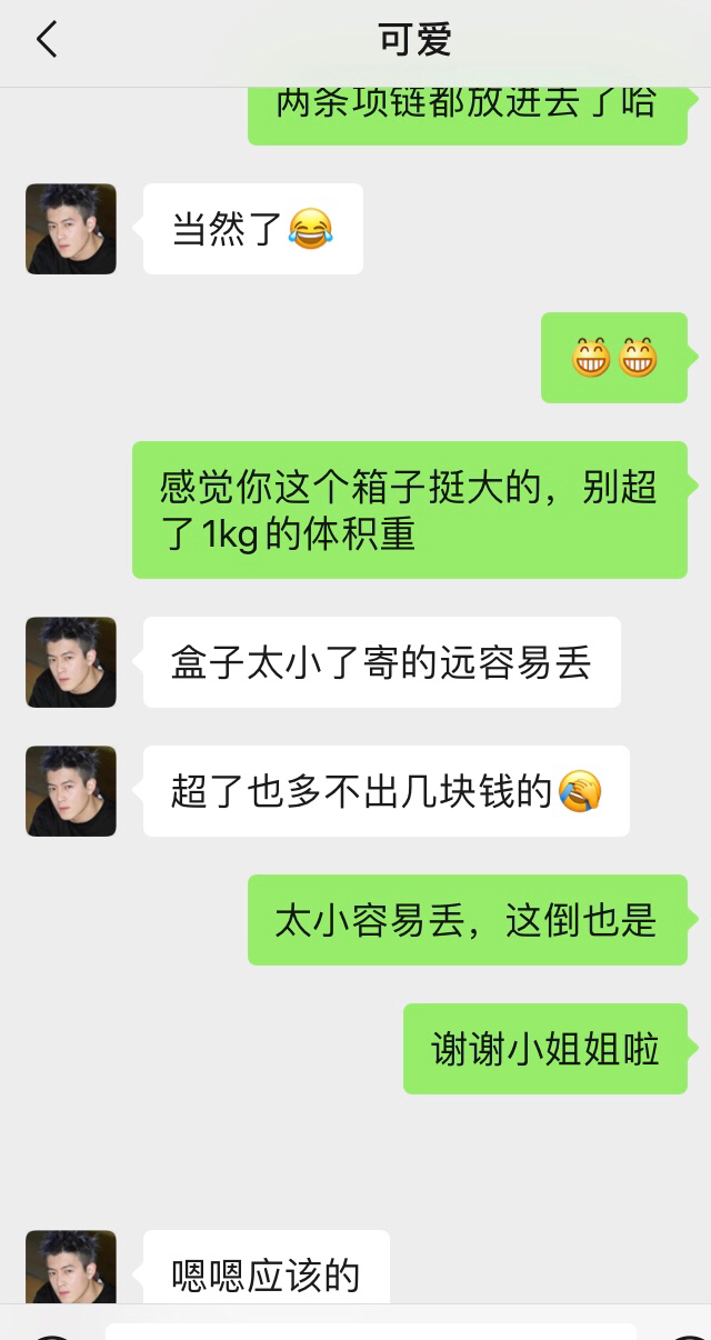 我看到它发过来打包的箱子很大的时候,我还说箱子太大了,邮费可能会多,它就会说“箱子小了容易丢,反正也不会多太多钱”,让你觉得哇,这个人真有爱啊。其实它只是想让你赶紧付钱!