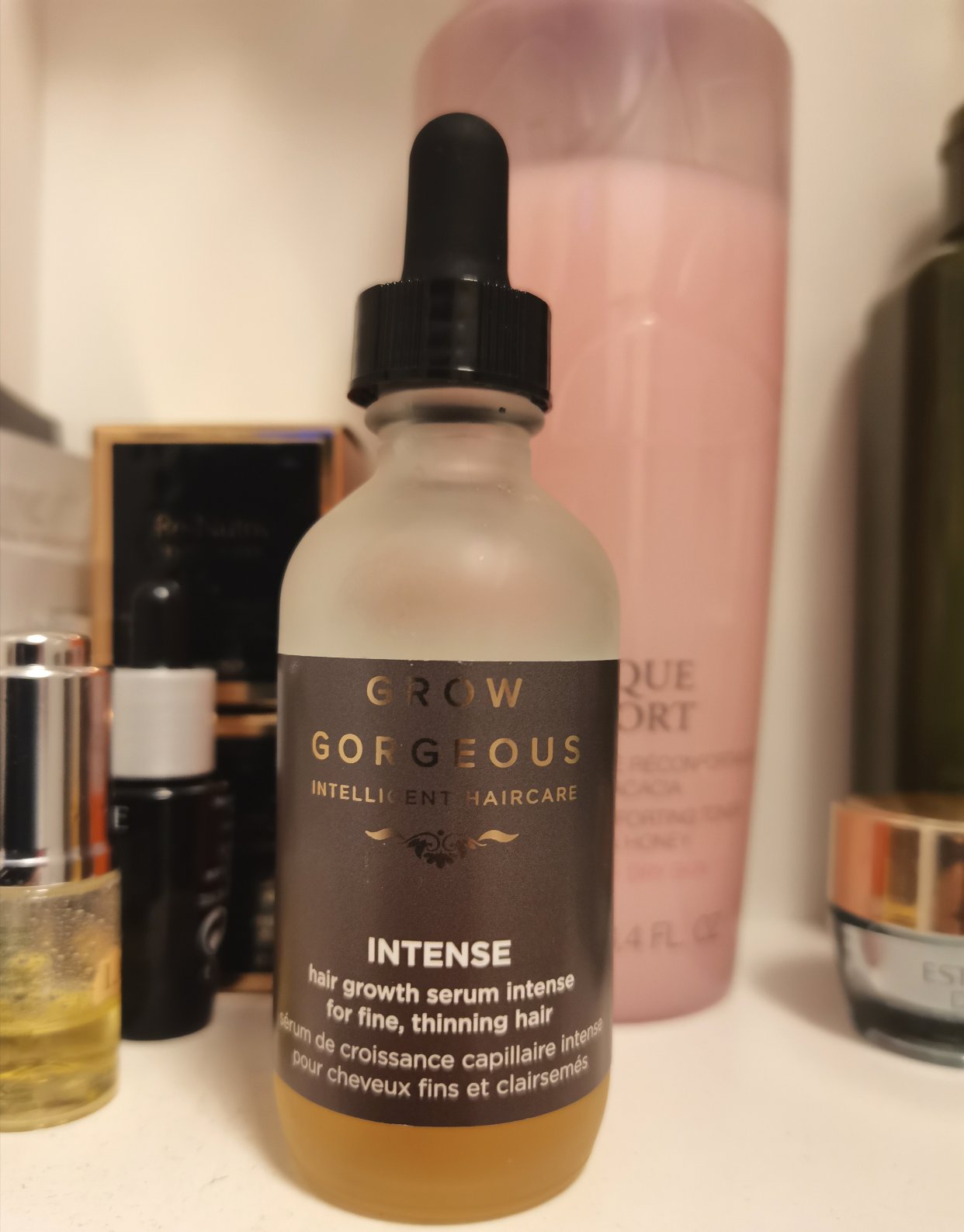 曾经也是头发浓密到需要打薄,发际线低到需要刮掉的程度。生了孩子以后无时无刻都在掉头发,发际线更是日渐后移越来越稀疏,以前还抱着自己头发多,掉点就掉点的心态安然度日,直到某一天照镜子的时候发现可以看见自己的头皮了,床上地上凡是我到之处必有头发,终于意识到不能再放任不管了,趁双十一打折的时候买了两瓶grow gorgeous的加强版生发精华!