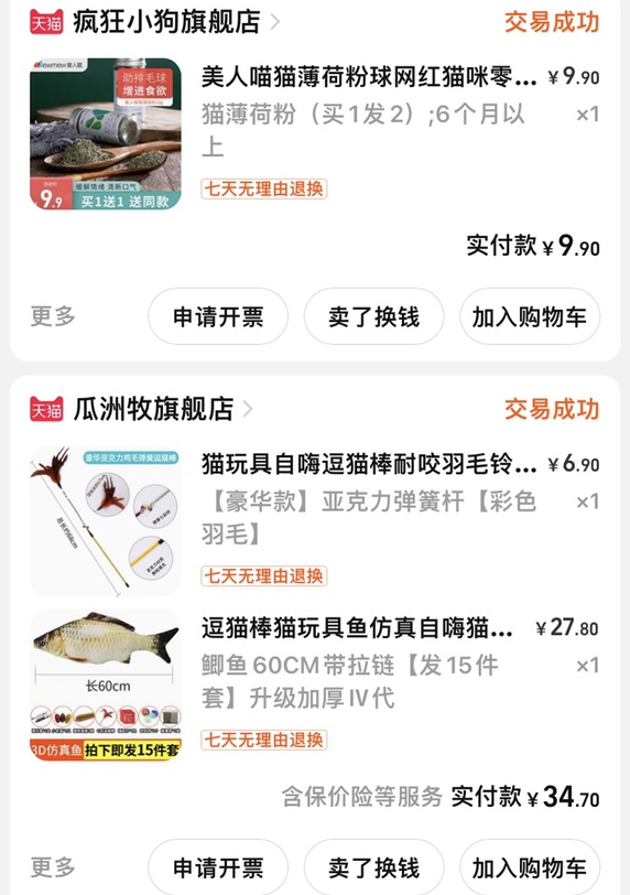 还有就是给家里毛孩子买的玩具!在淘宝买便宜而且这些东西又轻 既不占体积也不占重量 每次买可以买一大把 主要是我家肉总太费玩具了🤦🏻♀️