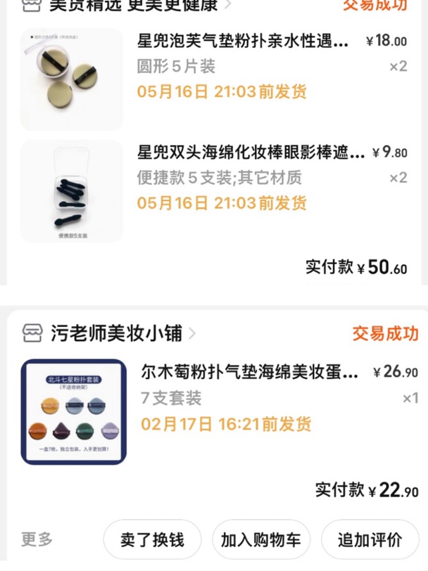 美妆蛋和气垫粉扑换着用 这种小东西还得是在国内买啊!在这边买就是大冤种!还不好用你说是不是!同理还有各种头绳发箍假睫毛啥的