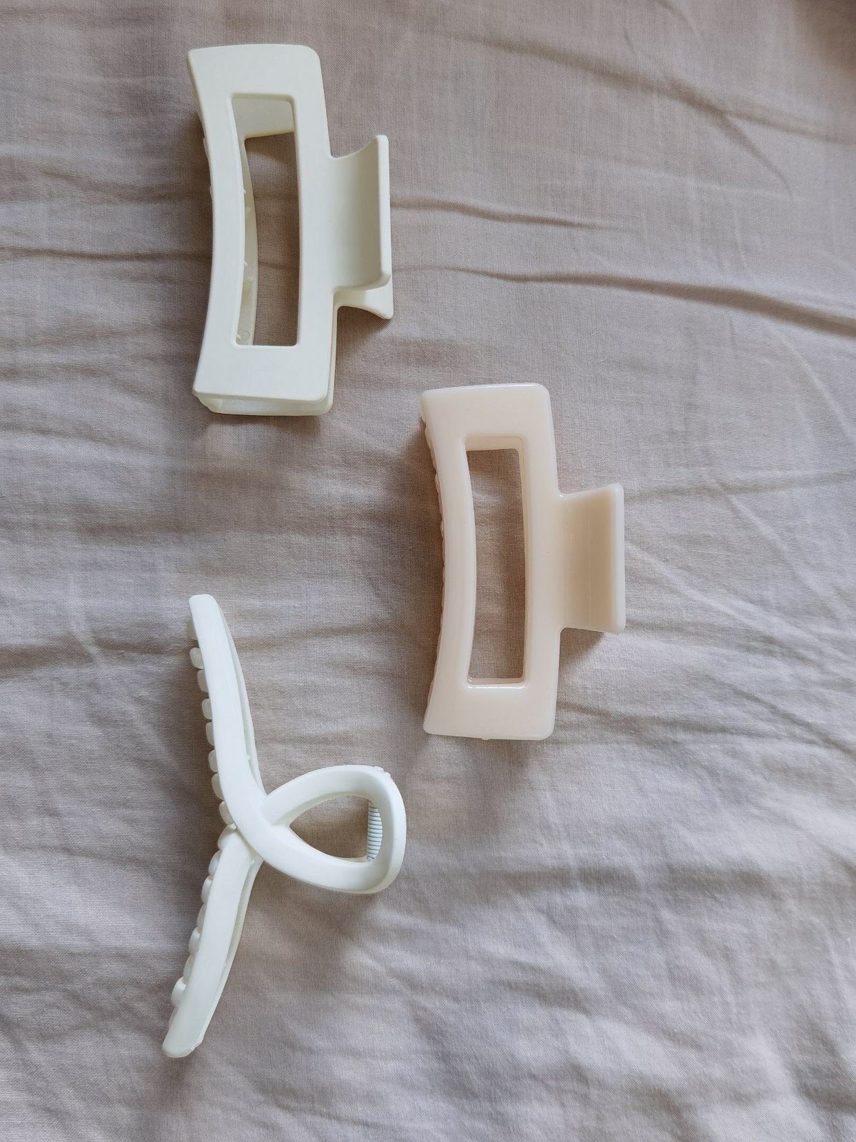 白色的两个是一套 肉色的我真的很心碎 自然光下简直和图片色差不要太大 要到暖光下才会觉得是那种象牙色 不会就当是避免了三个鲨鱼夹都是白色吧唉
